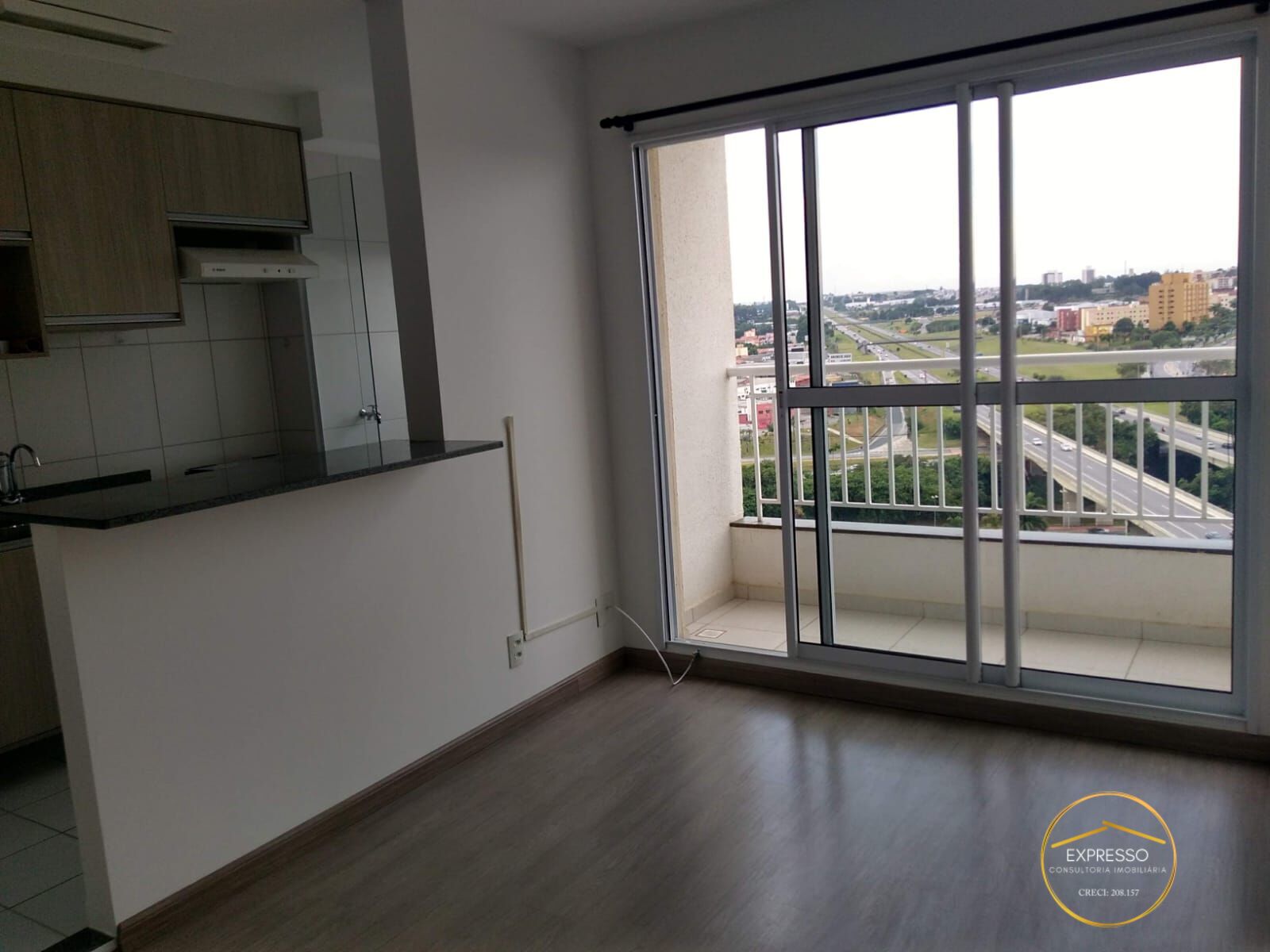 Sala de estar e jantar com sacada, cozinha americana com armários, área de serviço, 2 quartos e 1 banheiro. Piso laminado na sala e nos quartos. 1 vaga de garagem (sistema de sorteio para vaga coberta). Prédio com 2 elevadores.