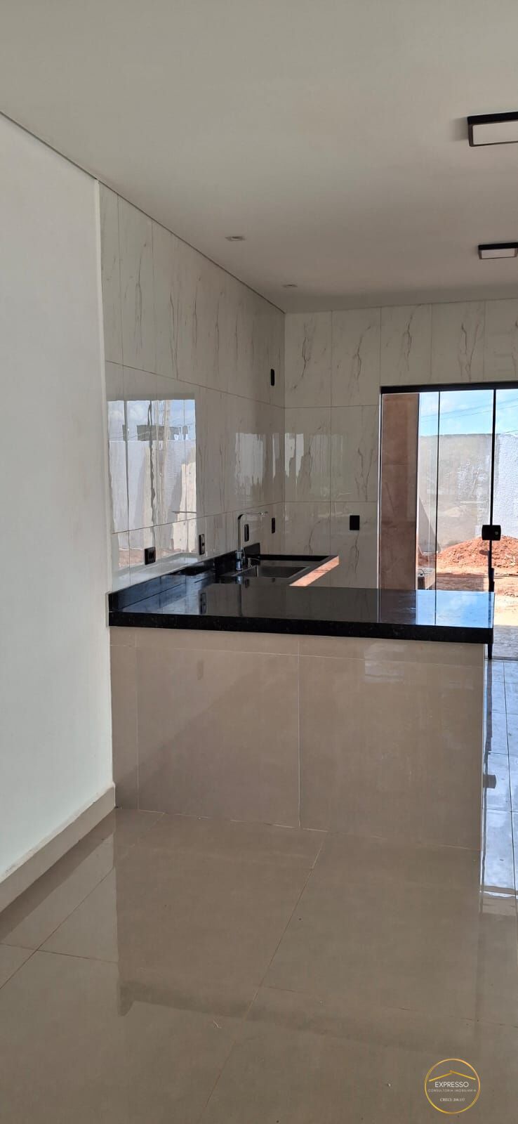 Casa térrea com 2 quartos sendo 1 suíte, sala de estar ampla, sala de jantar integrada, cozinha americana, banheiro social, área de serviço, área gourmet com churrasqueira, quintal.